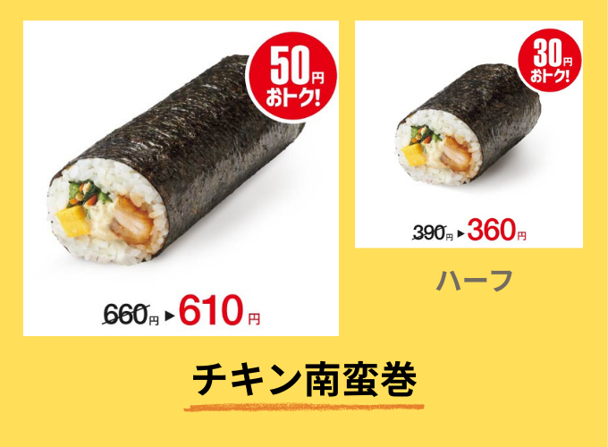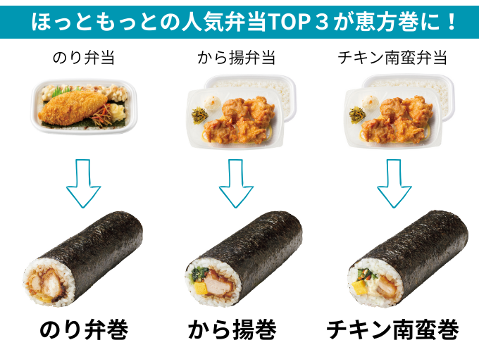 ほっともっとの人気弁当トップ3が、そのまま丸っと恵方巻に変身!『のり弁巻』『から揚巻』『チキン南蛮巻』という、もはや“好きな人しかいないでしょ”という3種類が勢ぞろいしています。こんなのスーパーでもコンビニでも見たことない!