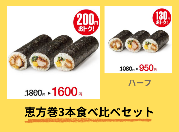 さらにハーフサイズも選べるので、親子でサイズ違いを用意するのもアリですよね。「どの味も捨てがたい…」という人には、全部まとめて味わえる「恵方巻3本食べ比べセット」もおすすめですよ!