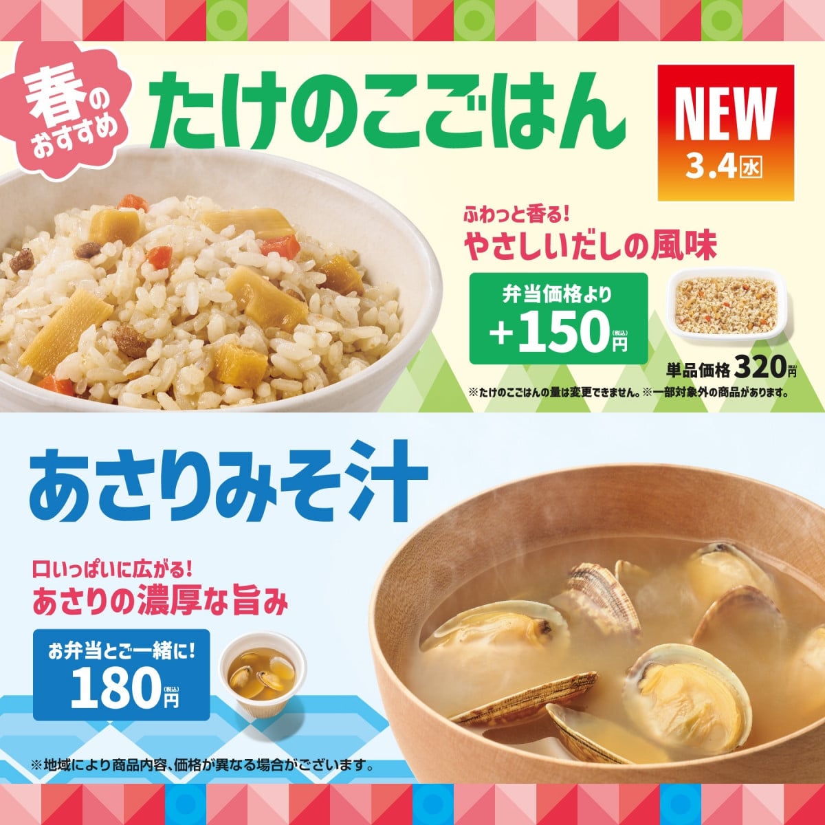 「たけのこごはん」も「あさりたっぷりみそ汁」も、今しか味わえない春限定のメニューです。うっかり食べ逃してしまう前に、ぜひお近くのほっともっとへ! お弁当のごはんを変更して豪華にするもよし、単品で自由に楽しむもよし。自分好みの組み合わせを見つけて、春の美味しいひとときを楽しんでくださいね。