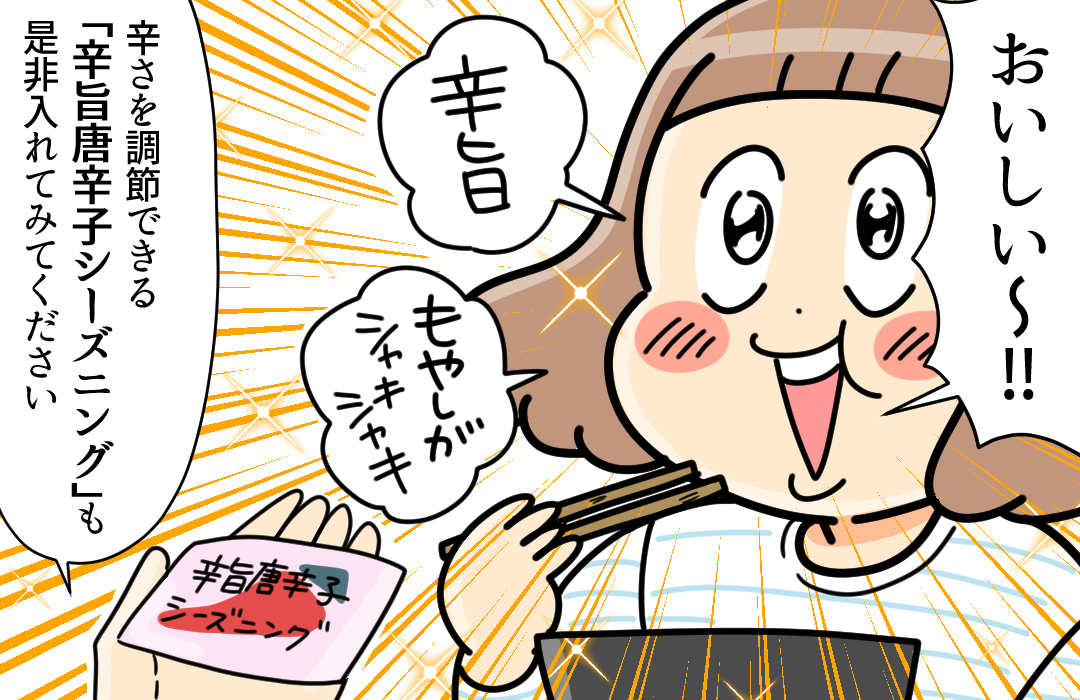 たっぷり入った「辛旨唐辛子シーズニング」は辛さの好みに合わせてふりかけて。辛さがあまり得意ではない方には、+100円で追加できる温玉付きもおすすめです。