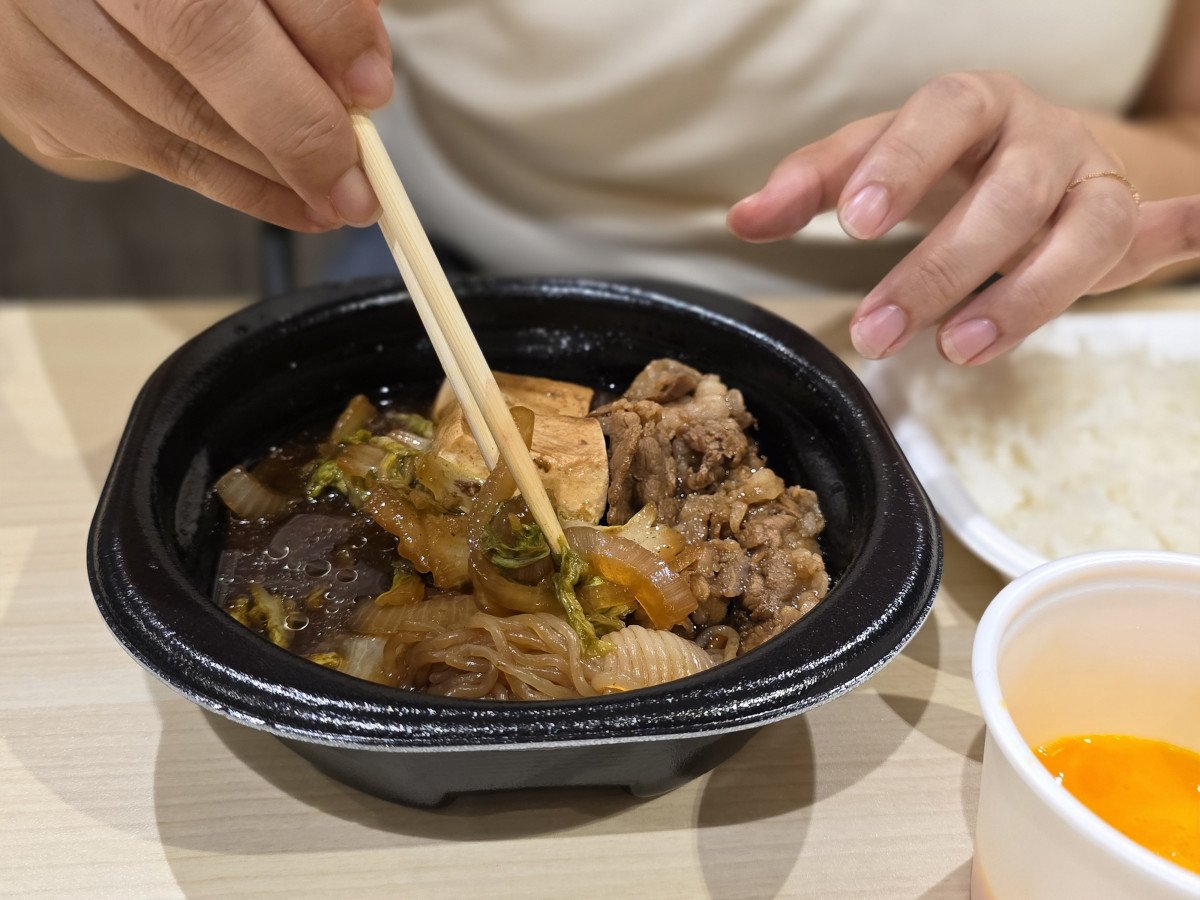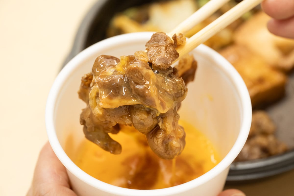 さらに “しっかり煮込んだ味わい”にもこだわっていて、店舗ごとに丁寧に調理しているから、牛肉と野菜のうまみがタレにしっかり溶け込んでいるんですよ。白菜は食感がよく、牛肉はやわらか。ここに別売りの生卵(70円)をとろ〜り絡めれば、もう言葉はいりません。まろやかで、箸が止まらないおいしさです。