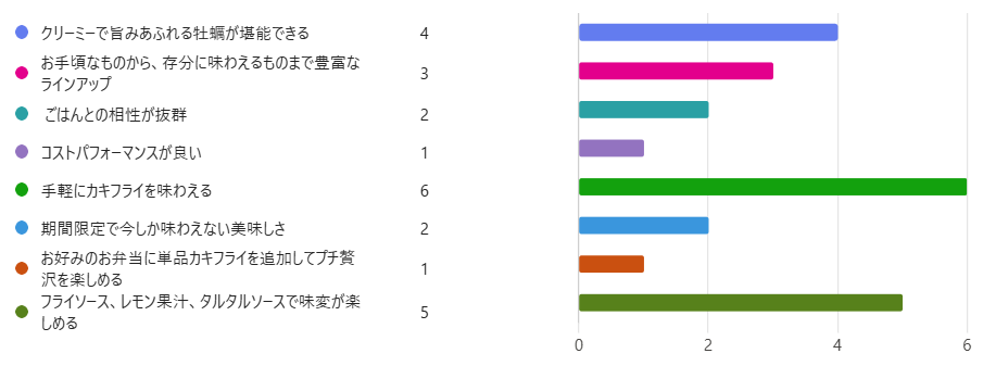 最も多くの票を集めたのは『手軽にカキフライを味わえる』というポイントでした。以下2位は『フライソース、レモン果汁、タルタルソースで味変が楽しめる』、『クリーミーで旨みあふれる牡蠣が堪能できる』でした。