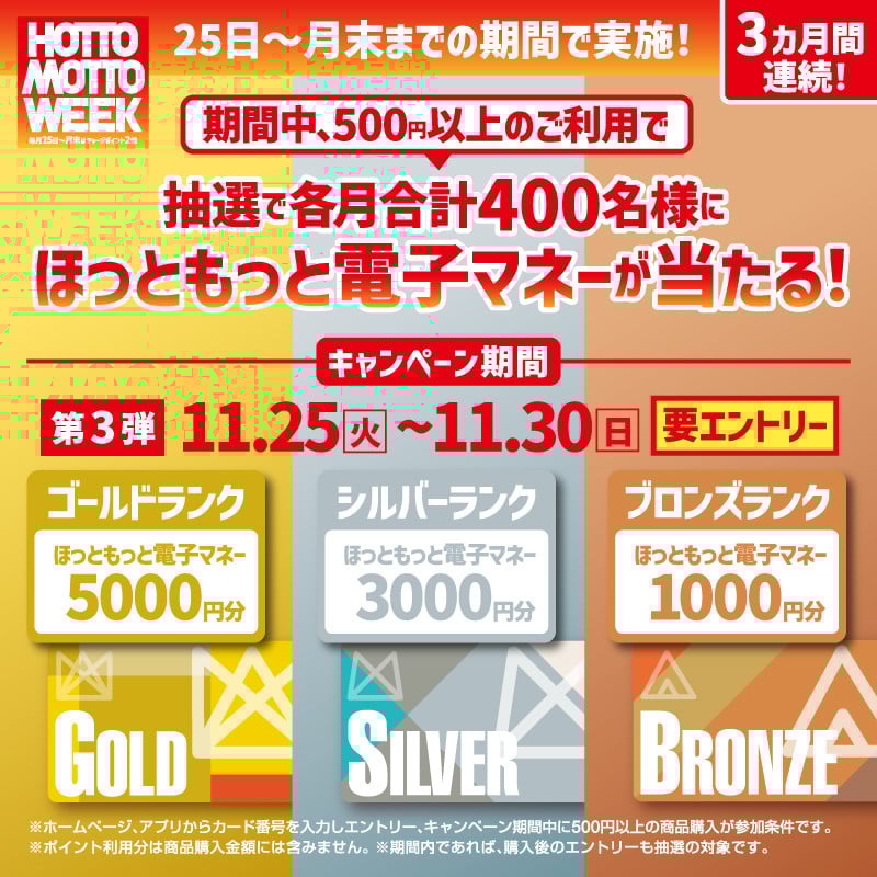■【アプリ限定】会員ランクがアップするほど賞品が豪華に! 『3カ月連続!HOTTO MOTTO WEEKキャンペーン!』