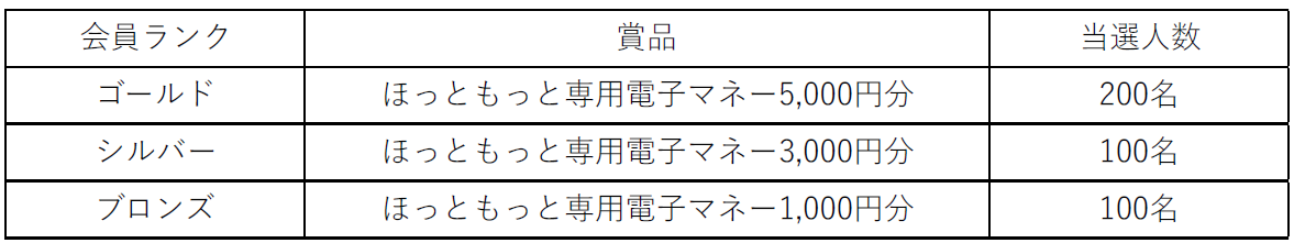 〇期間中、500円以上のご利用で各月合計400名様に会員ランクに応じたほっともっと専用電子マネーが抽選で当たる!