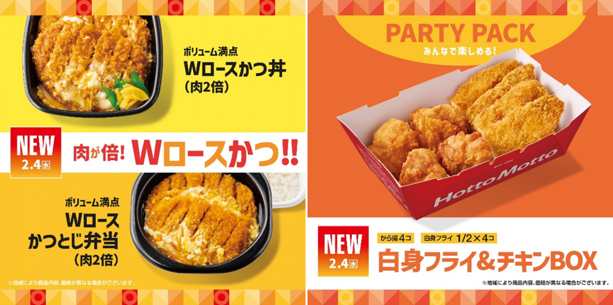 このたび「ほっともっと」では、定番人気メニューのロースかつを2倍にした『Wロースかつ丼(肉2倍)』960円と『Wロースかつとじ弁当(肉2倍)』990円、シェアして楽しめる「パーティパック」シリーズの新メニュー『白身フライ&チキンBOX』690円を2月4日(水)より新発売いたします。