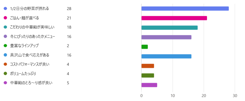 最も多くの票を集めたのは『1/2日分の野菜が摂れる』というポイントでした。2位は『ごはん・麺が選べる』、3位は『こだわりの中華餡が美味しい』でした。