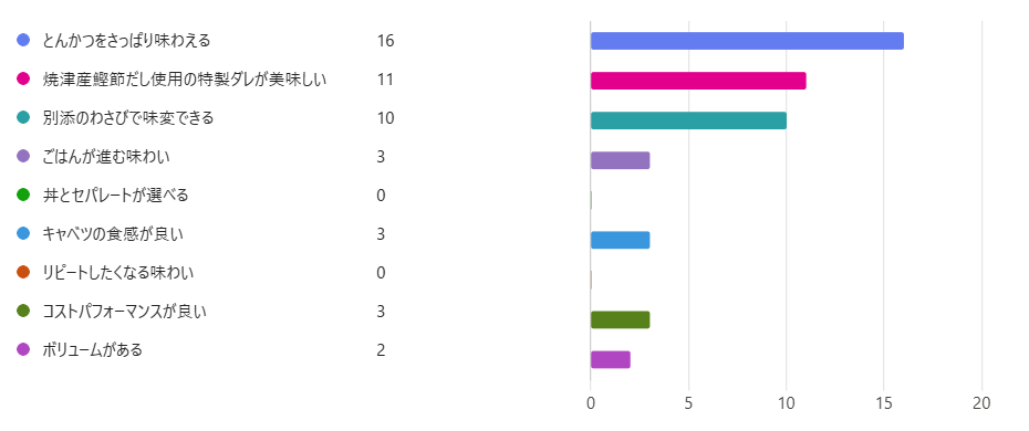 最も多くの票を集めたのは『とんかつをさっぱり味わえる』というポイントでした。2位は『焼津産鰹節だし使用の特製ダレが美味しい』、3位は『別添のわさびで味変できる』でした。