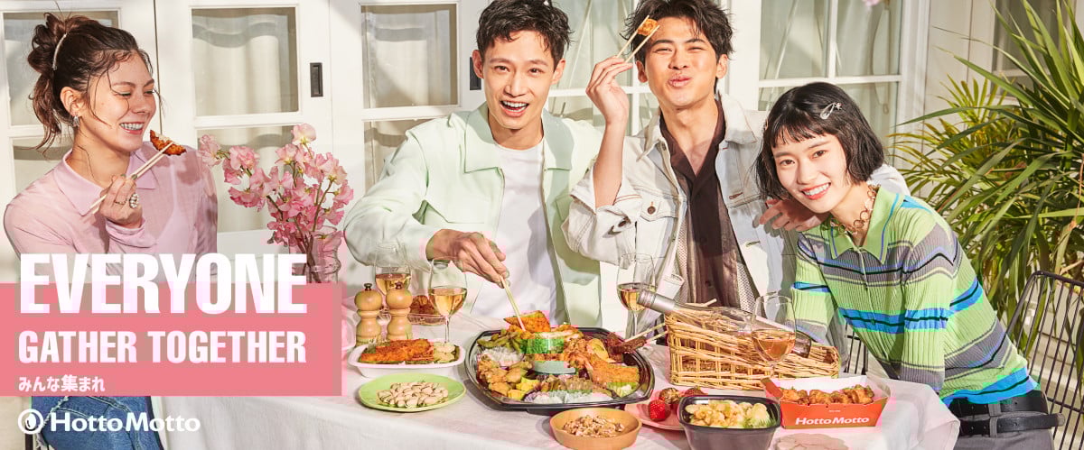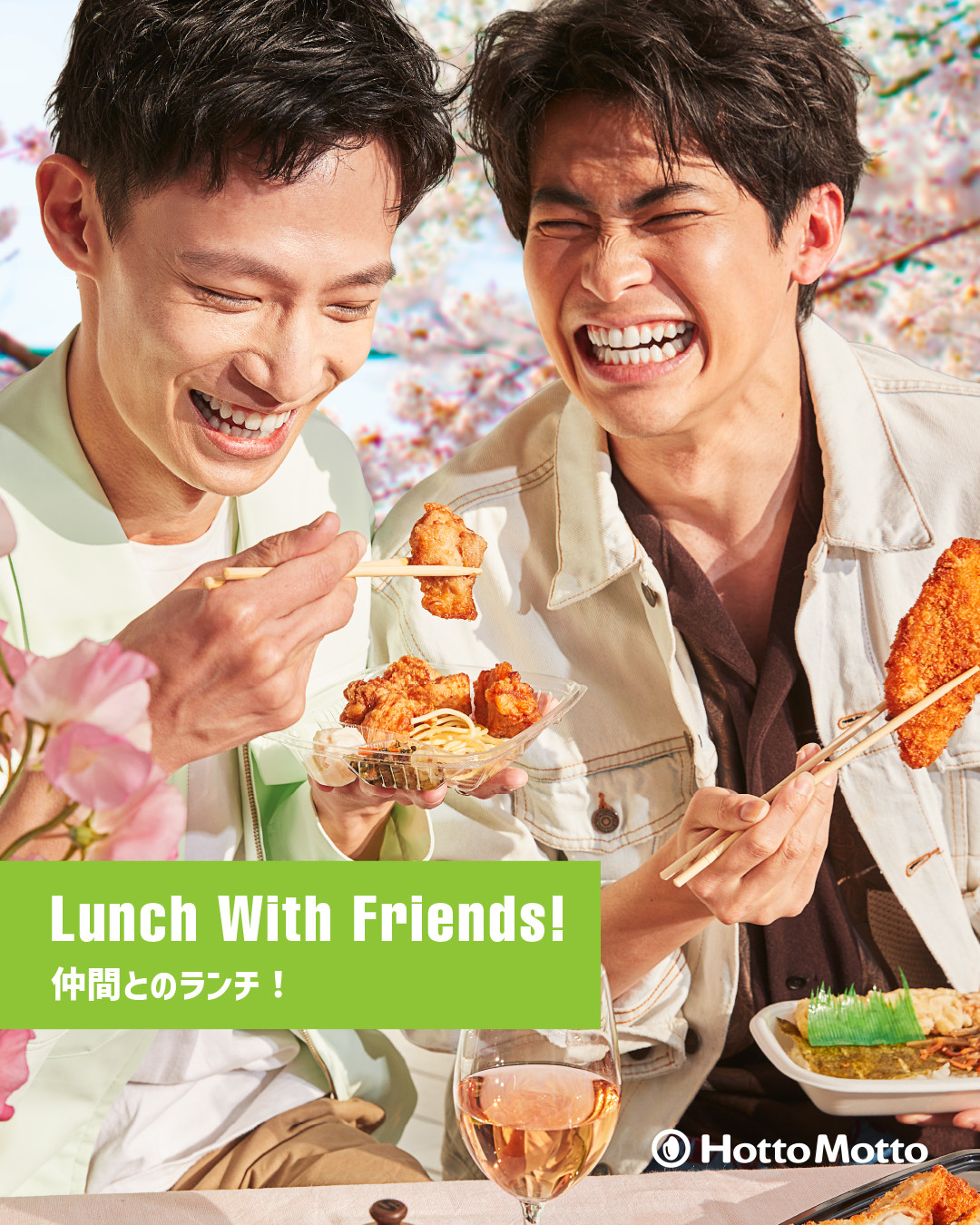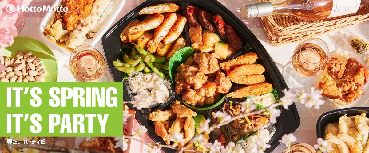 ほっともっとのオードブルを囲む男女4人の笑顔が、春のワンシーンを鮮やかに彩る。